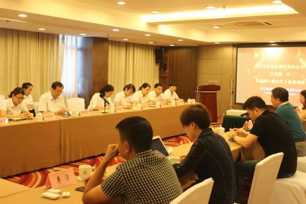参观结束后,双方展开座谈交流。东方集团党委书记、董事长潘廉耻,总裁毛春燕,旅业事业部总经理叶小丽等参加座谈。
